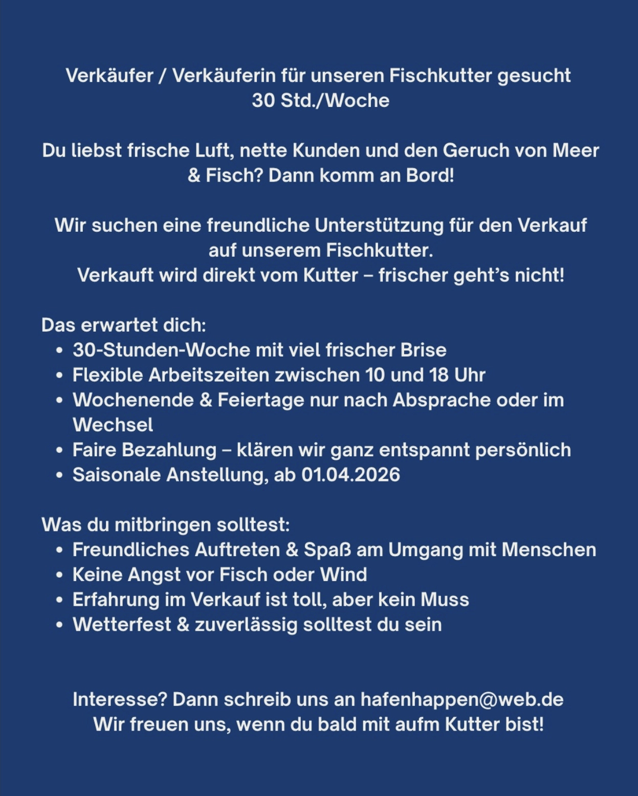 Ob direkt am Kutter, entspannt auf der Hafenmauer oder bei einem Spaziergang am nahen Strand: Bei Hafen-Happen erleben Sie den unverwechselbaren Geschmack der Ostsee in authentischer Atmosphäre. Kommen Sie vorbei und lassen Sie sich von unserem Team verwöhnen!